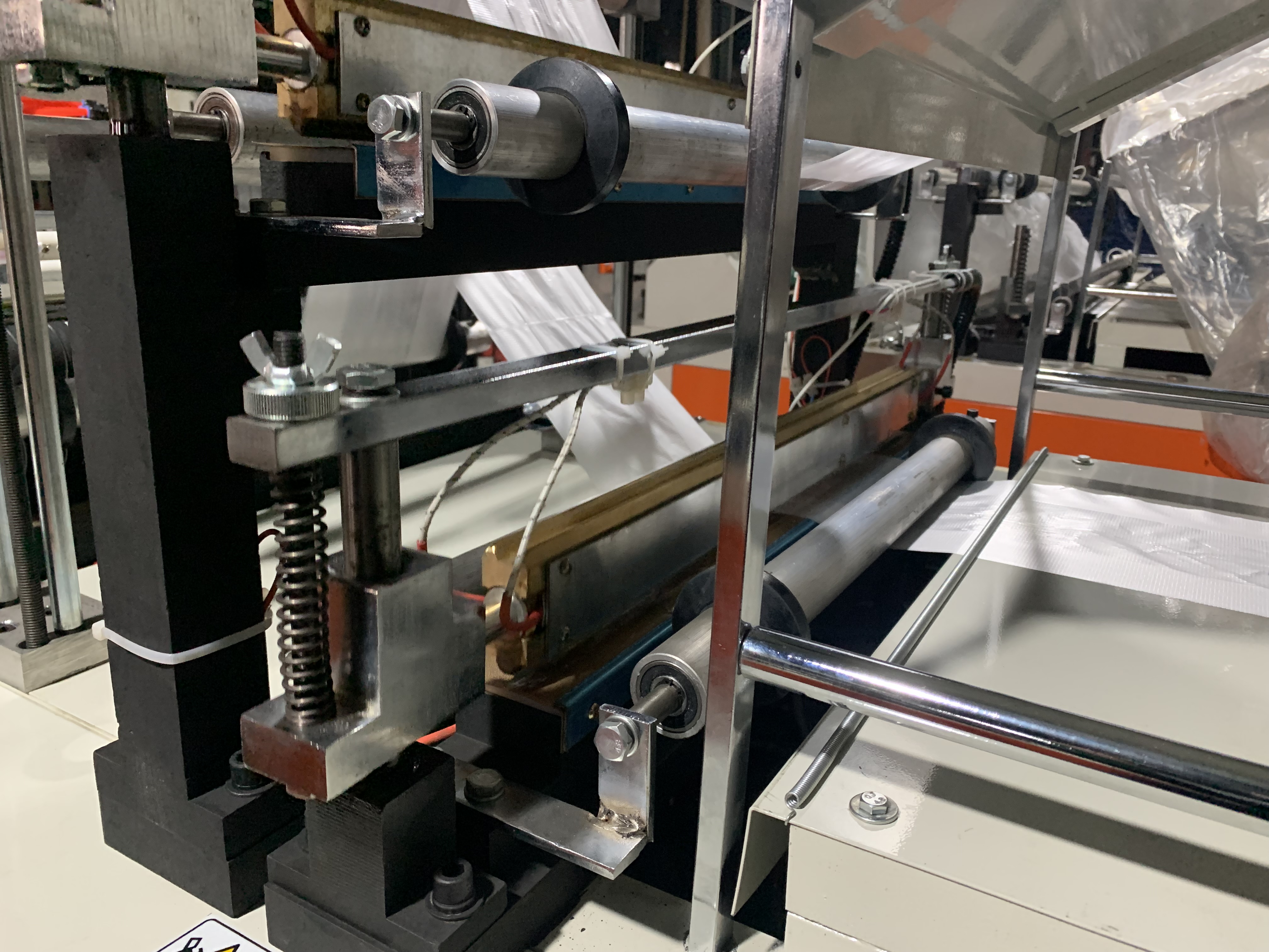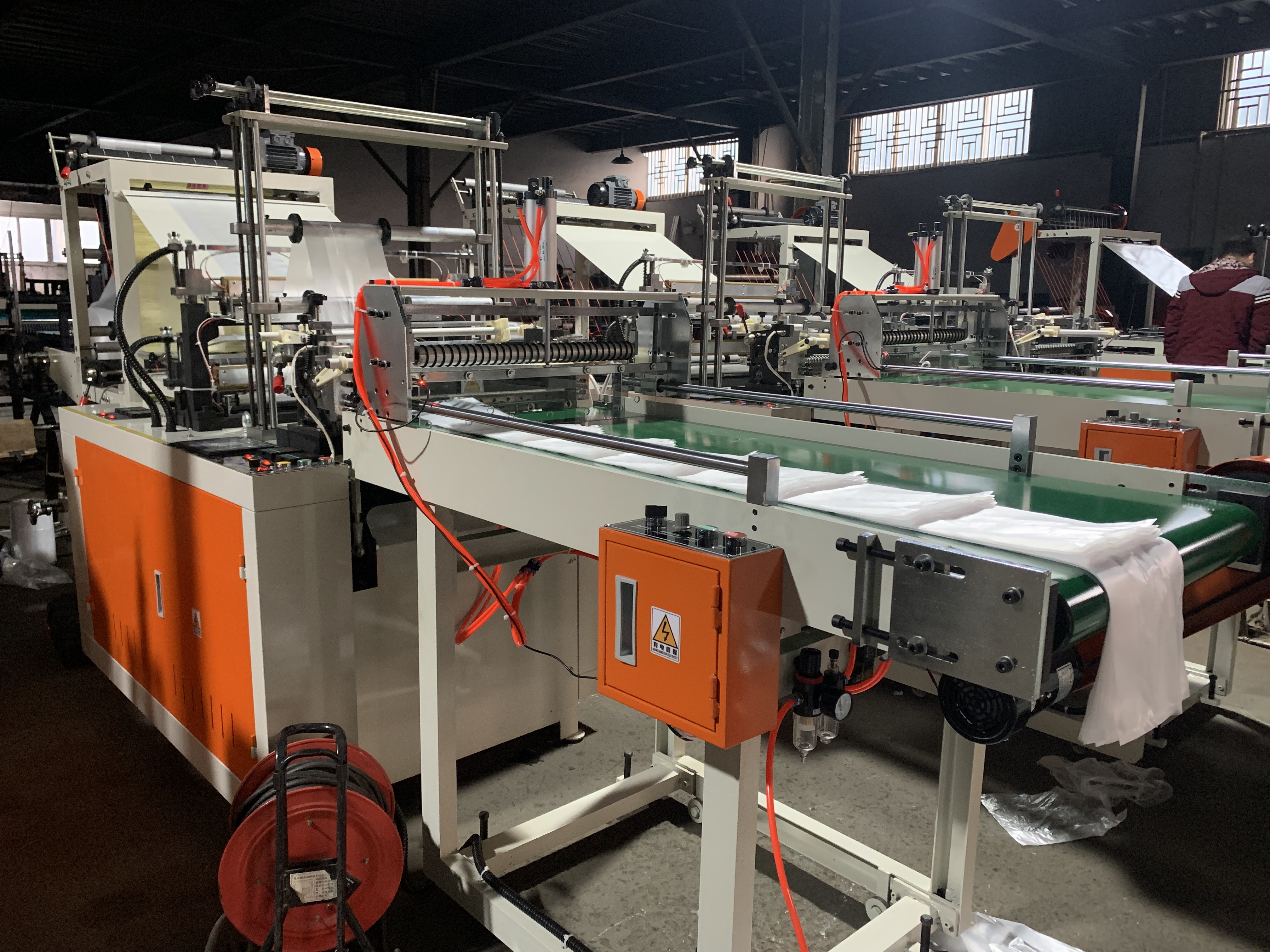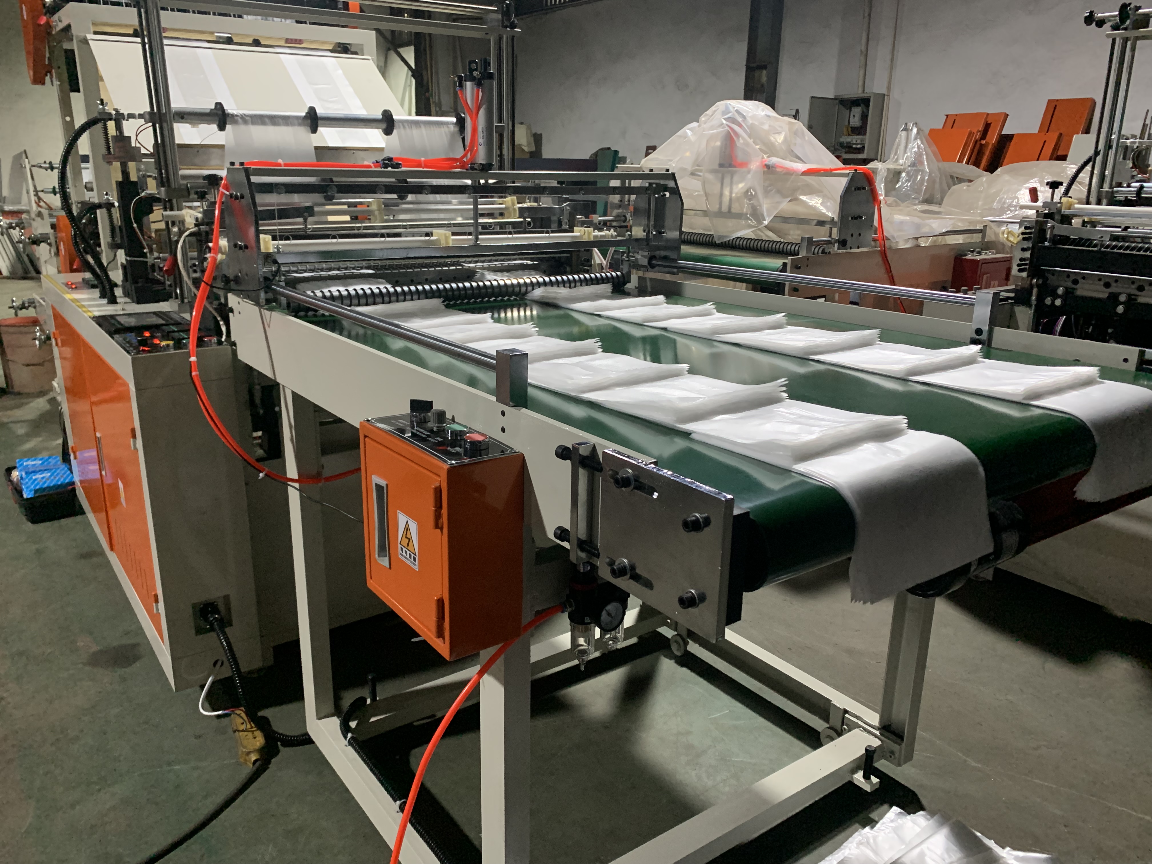 The cutting machine is used to produce flat bag, shopping bag , it is belong to hot sealing cold cutting type. If add a manual or automatic puncher , it can produce t shirt bag/ vest bag ,supermarket shopping bag .