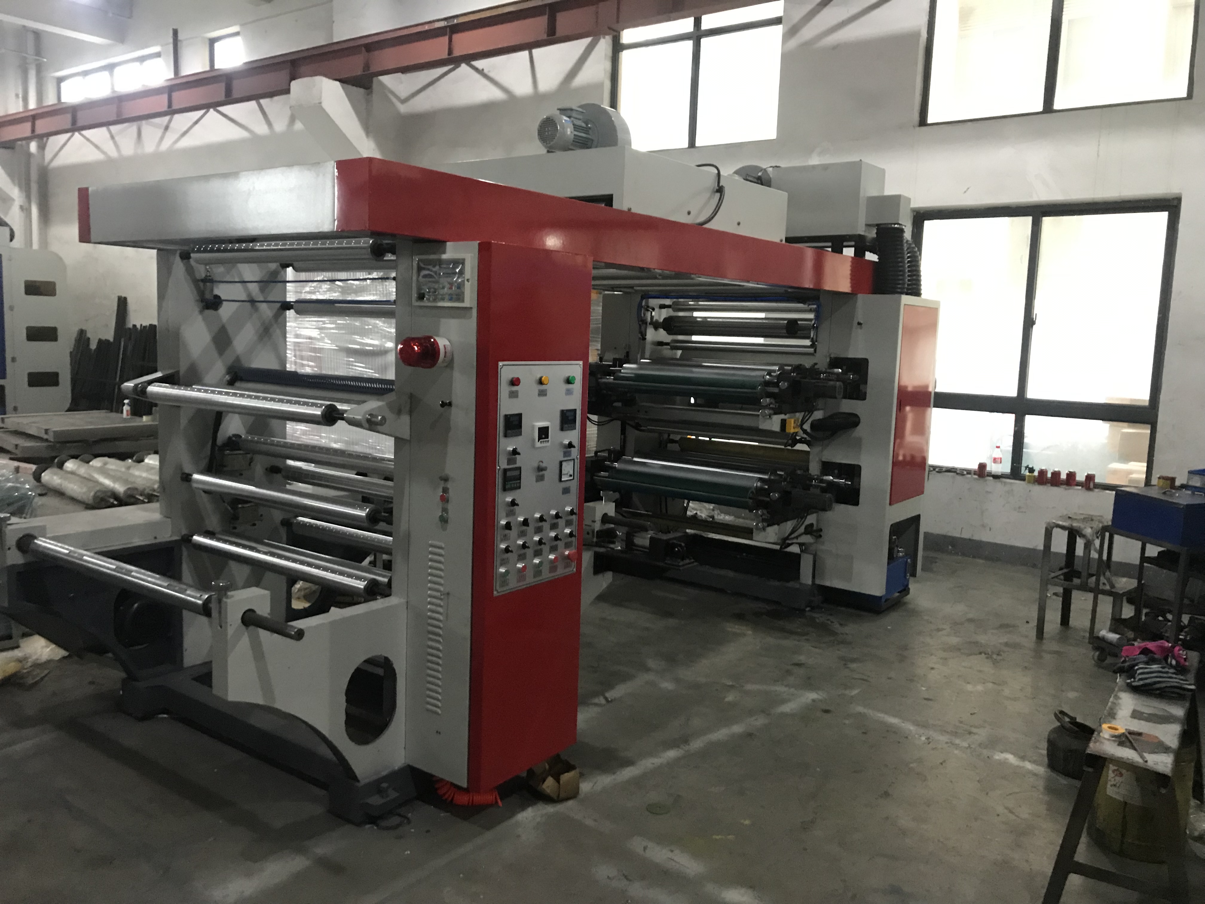 The high speed flexographic printing machine uses photosensitive resin plate as the printing plate of flexographic printing machine. It adopts water-based ink and has advantage of low edition-producing cost.