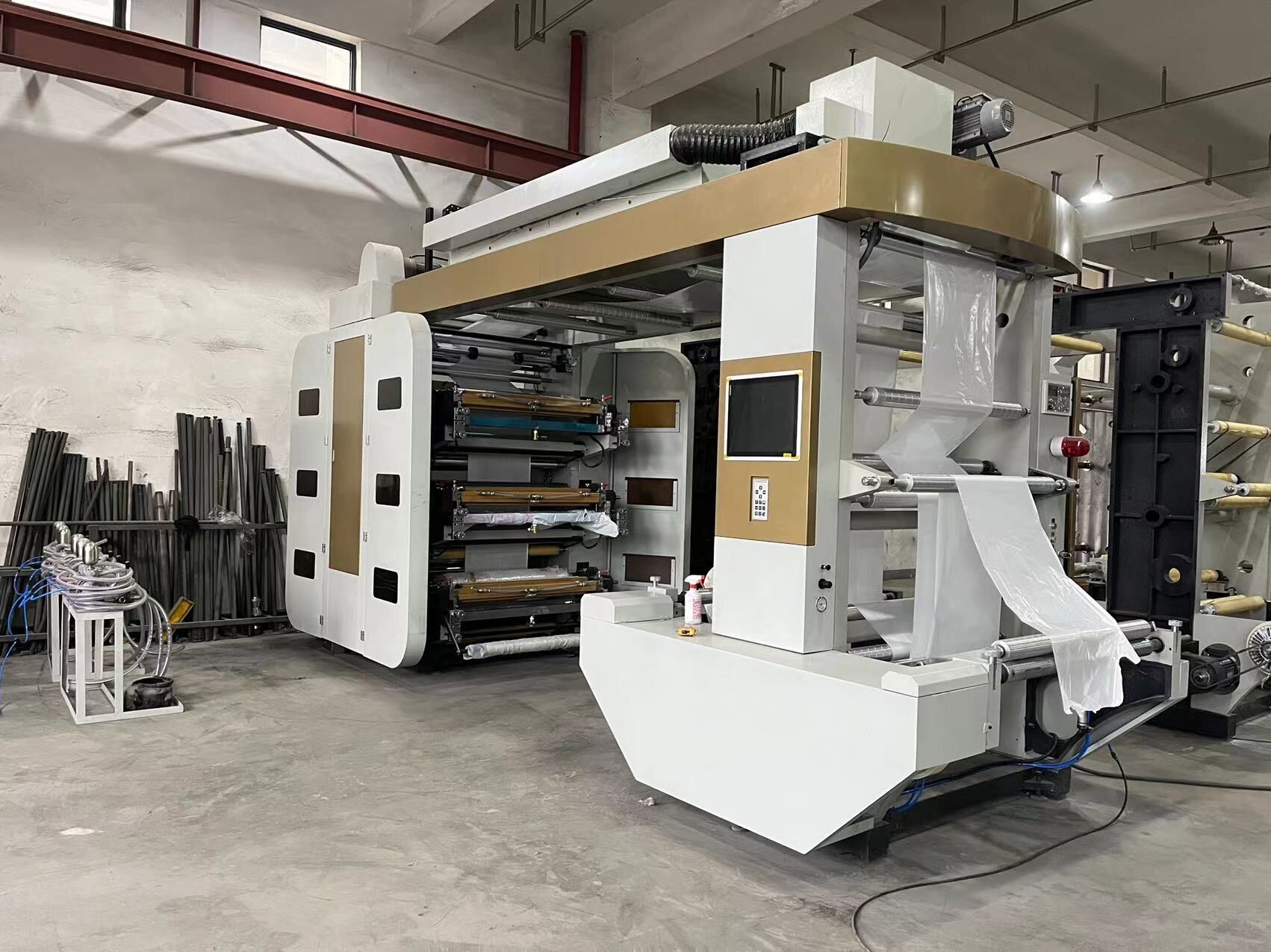 The high speed flexographic printing machine uses photosensitive resin plate as the printing plate of flexographic printing machine. It adopts water-based ink and has advantage of low edition-producing cost.