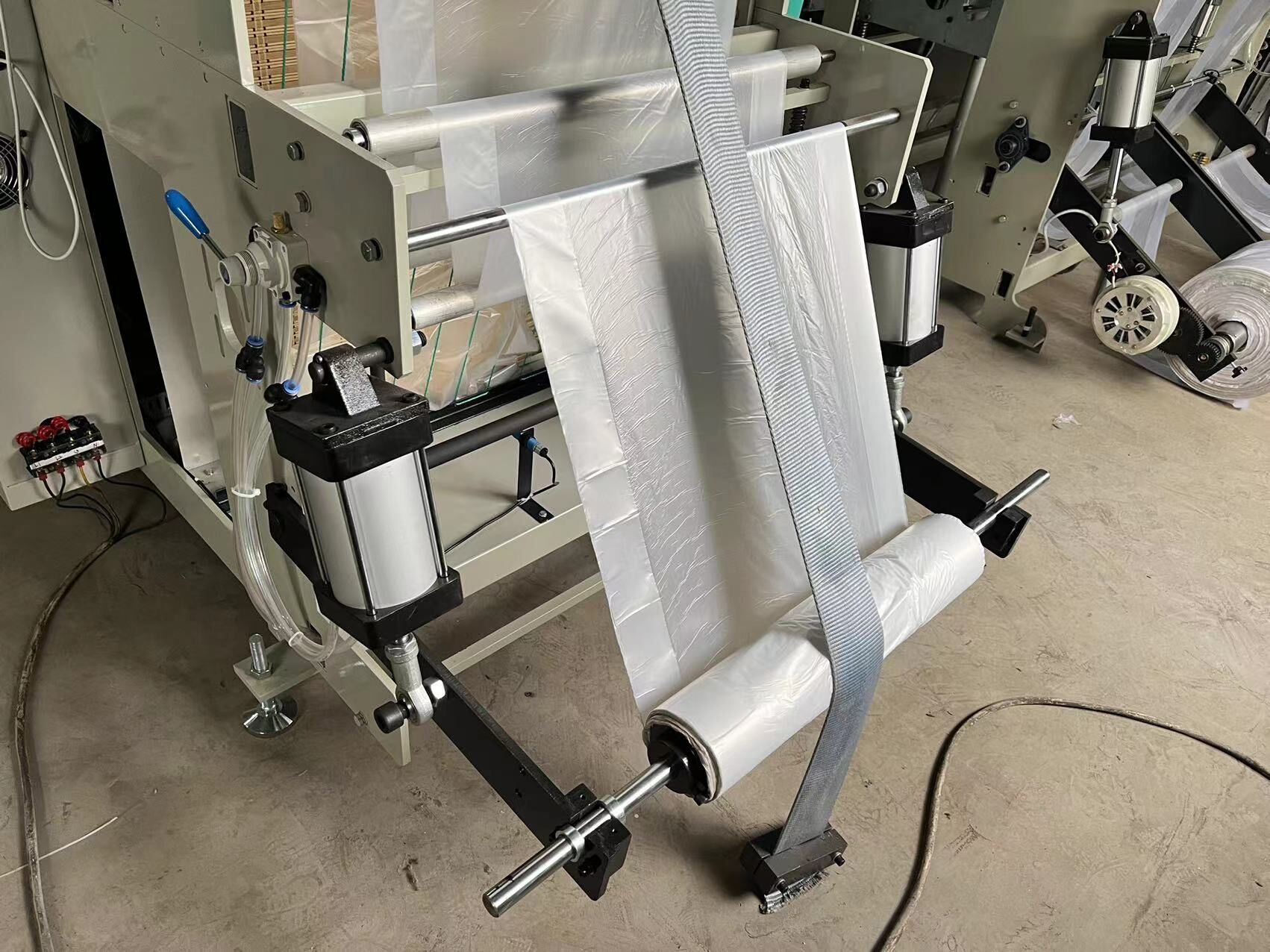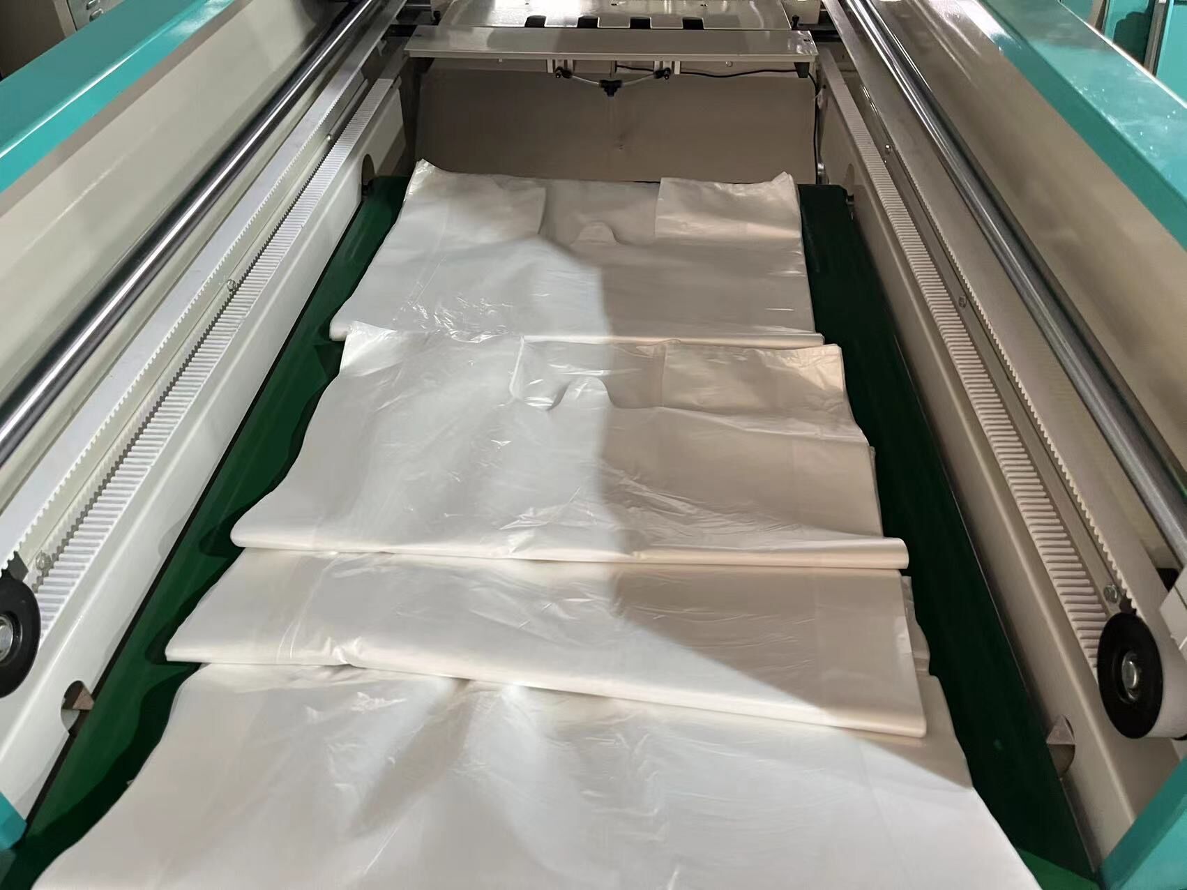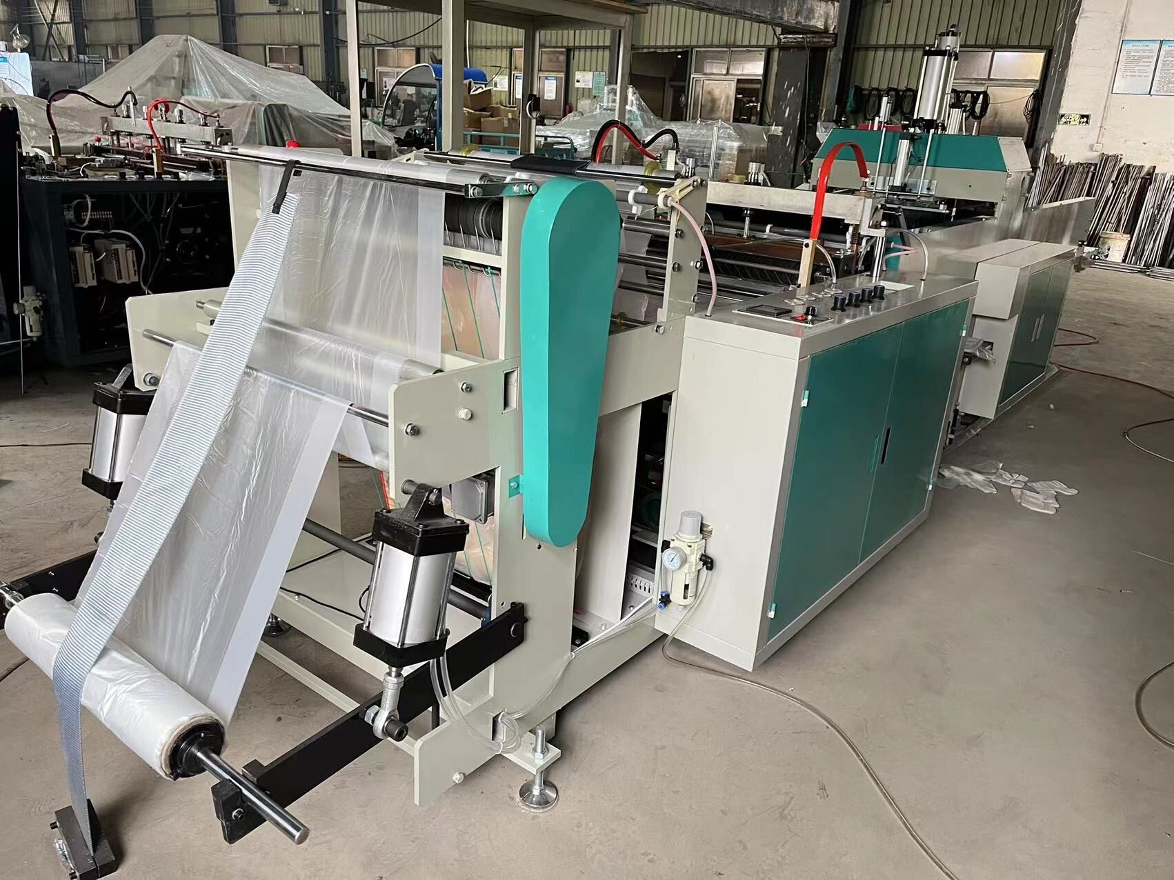 The automatic t shirt bag making machine is used to produce printed t shirt / vest shopping bag. The hot sealing knife and hot cutting knife are designed together in order to achieve non-stretch bag making and speed improving.